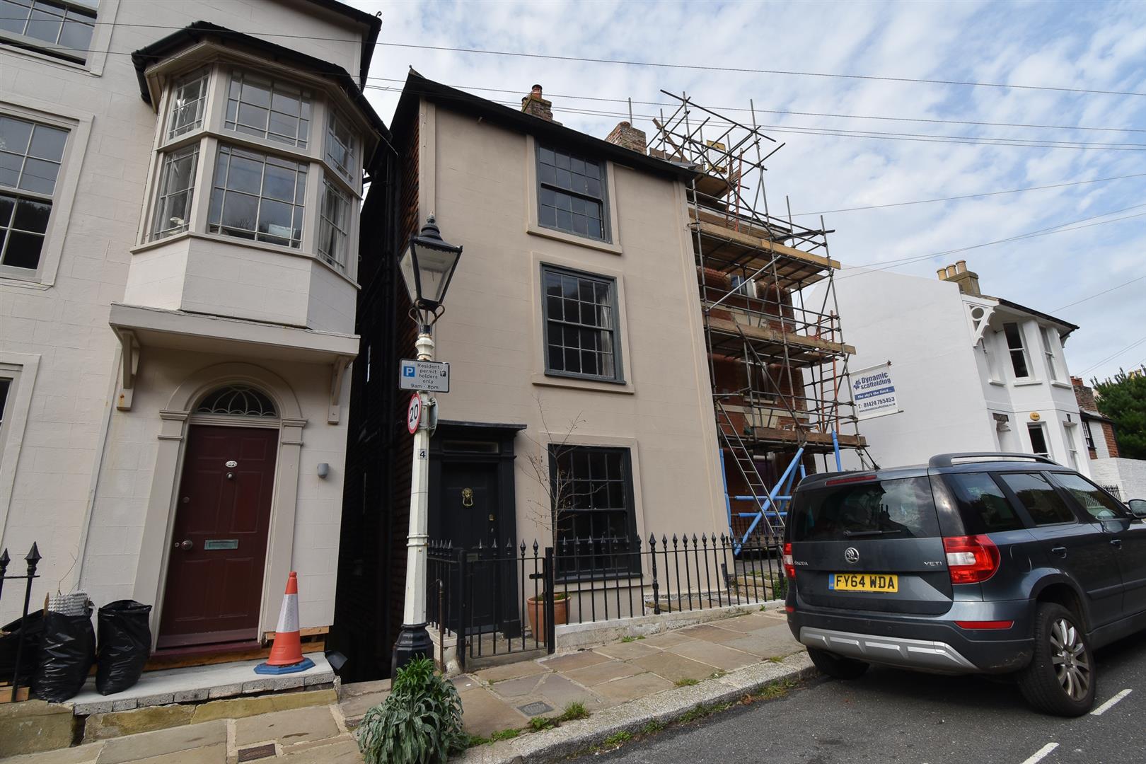 An authentic Grade II listed four storey Georgian Townhouse, nestled at the foot of the East Hill and just moments from the bustle of Hastings Old Town and beach. The accommodation here has SYMPATHETICALLY RESTORED with LOCALLY SOURCED MATERIALS, handmade tiles and cast iron radiators which pay homage to the original features which remain intact. Exposed wooden floorboards flow throughout the well designed space and the walls have been plastered with textured, lime plaster. The front of the house bathes in the morning sun and features an OUTLOOK OF THE RUGGED EAST HILL with sea glimpses while the rear of the property is perfectly positioned to enjoy ‘golden hour’, showcasing FAR REACHING VIEWS. You enter on the ground floor where there is a double bedroom with original fitted cupboards and shutters, the living room can be found across the hallway, fitted with a wood-burning stove and a LARGE BAY WINDOW which frames SPECTACULAR VIEWS across the rooftops of the Old Town, towards the West Hill. The lower floor houses a BESPOKE KITCHEN with a USEFUL UTILITY ROOM and downstairs cloakroom, there is a SEPARATE DINING ROOM with exposed copper pipes and an attractive outlook of the walled rear garden. There is a charming double bedroom on the first floor together with a large family bathroom which enjoys a freestanding bath with a shower attachment. There are two further bedrooms on the upper floor which feature vaulted ceilings and are fitted with hand-built wardrobes and desks, there is a Jack and Jill cloakroom servicing both bedrooms. Externally the walled rear garden provides a quiet and private oasis to enjoy the afternoon sun and dine al-fresco.